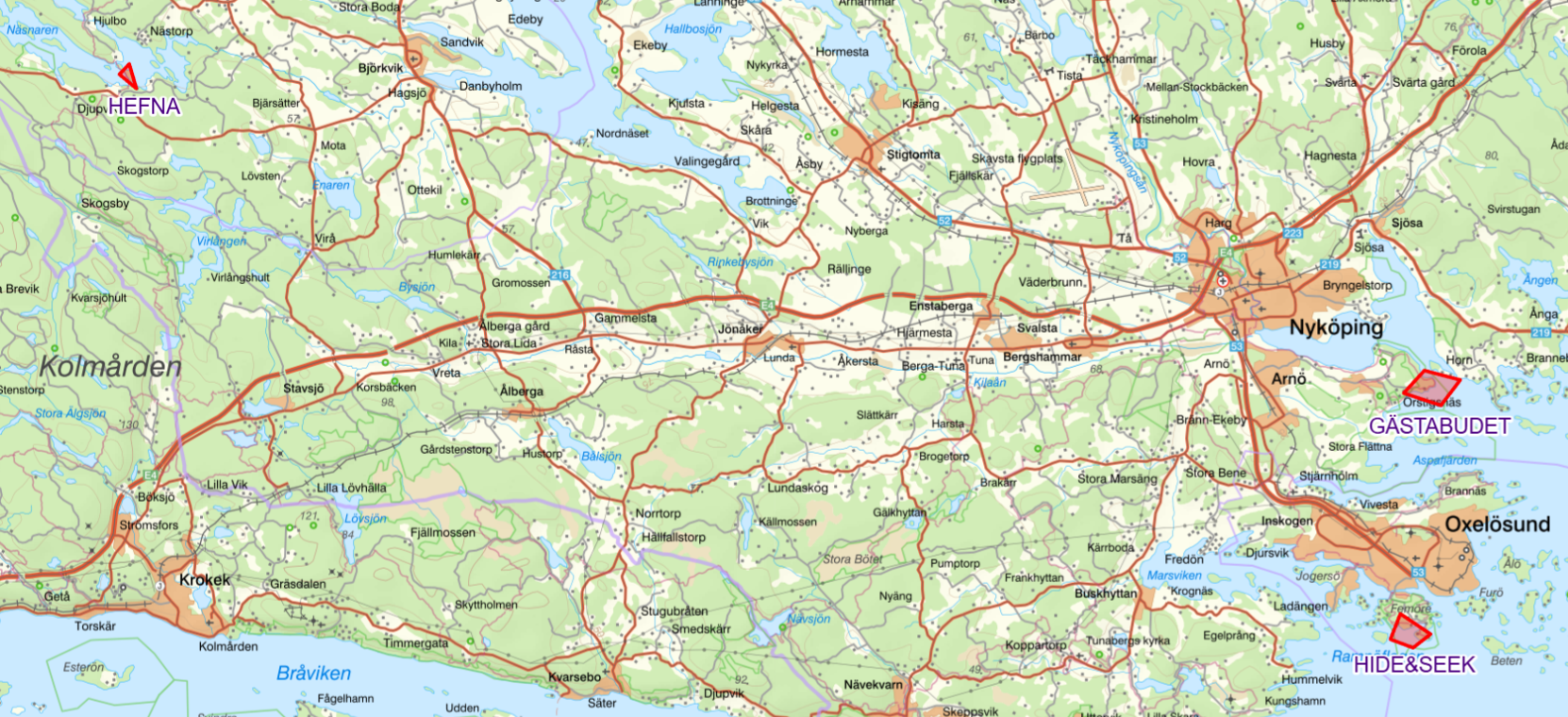 The 3 shelters are located in the south part of Sörmland all along the trail Sörmlandsleden. Click on each construction below for more information and link to Google Maps and how to get there.